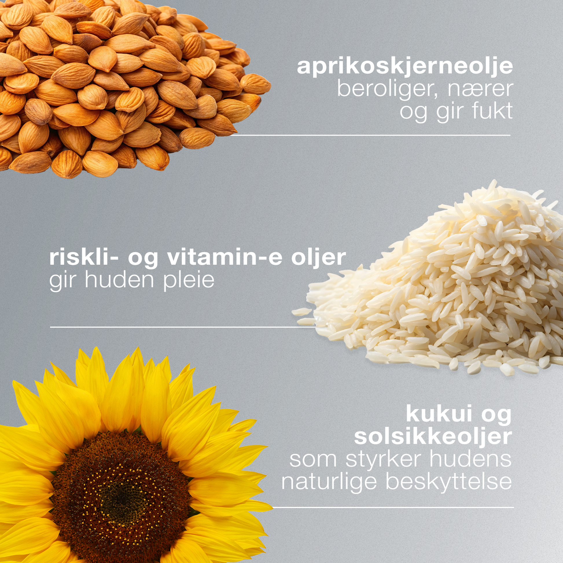Oljer fra oliven, kukui og aprikos fjerner effektivt overflødig talg, solkrem, vannfast sminke, forurensing og produktrester som legger seg på huden i løpet av dagen. Mykgjørende riskli og vitamin-e gjør denne milde blandingen til en dyprens som passer alle hudtilstander - selv de fetere. Uten kunstig farge eller duft.